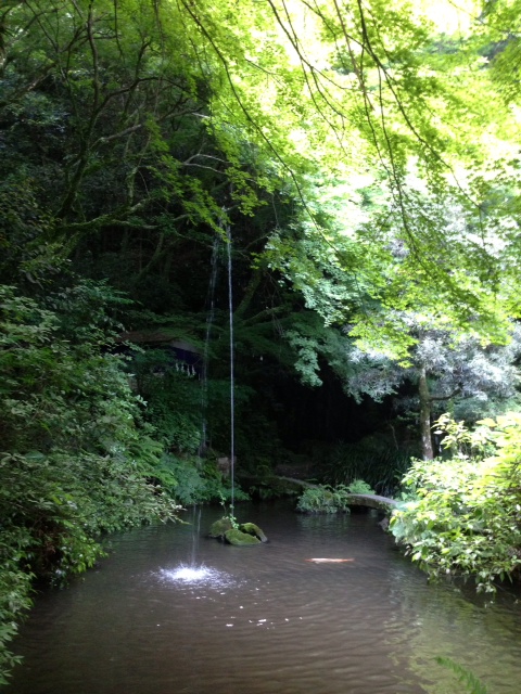 この池の噴水は滝の上にある石のタンクに滝に流れる水を溜めて流し、その落差で水が4メートルほど吹き上がるようになっています。